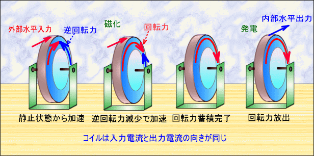 それに対し、コイルは流れ込んだ磁化電流と、磁力が電力に戻るときの発電電流が同方向という、コンデンサーとは全く逆の特徴を持っています。