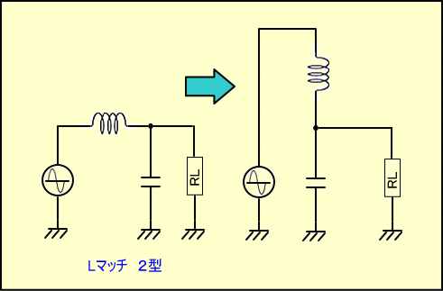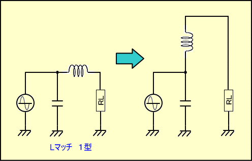 以上の事を念頭に置いて、まずLマッチ1型回路を少し変形すると、下の図のようになります。