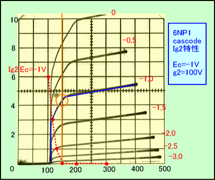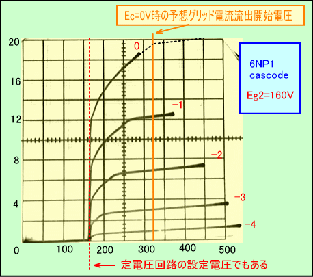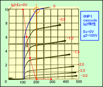 こうして出したEc=0V時のIg2測定値を、カーブトレーサーのグラフに合わせてみると、傾斜の始まる地点から急にグリッド電流が増えていることがわかります。