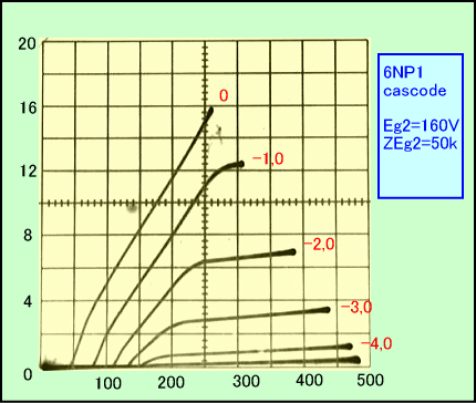 さらにEg2=160V時のカーブをもう一度見てみると、やはり同じ傾向がはっきり表れ、カスコード接続ではプレート電圧が最低でもEg2の2倍となるように、プレート供給電圧と負荷抵抗の値を設計することが大事だとわかりました。