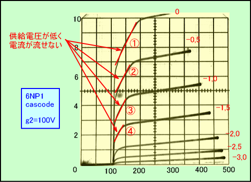まず特徴的な肩特性がなぜ起こるのかを、上の球がが定電圧回路である観点から見ると、供給電圧値の不足による電流不足が考えられます。というのも3極管ではプレート電流はプレート電圧に依存しているからです。