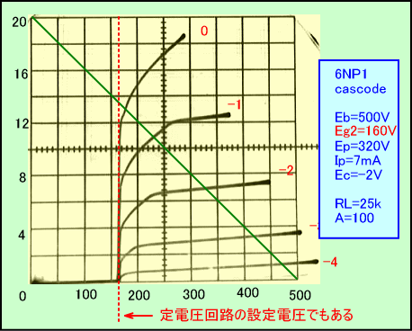 しかしこれこそが、上の球による定電圧回路が存在する証しとなります。即ち上の球のグリッド電圧がほぼ定電圧回路の設定電圧となるため、それ以下のプレート供給電圧では、定電圧回路が作動し始めないわけです。