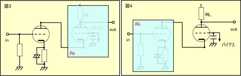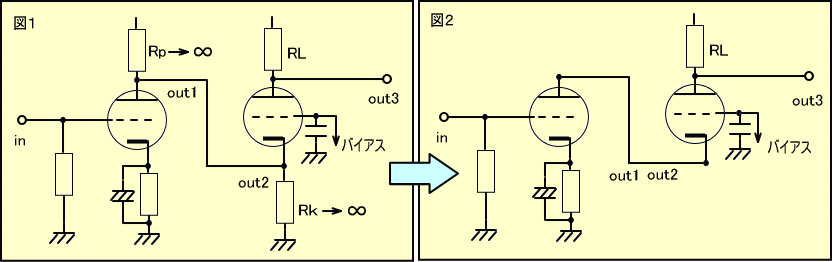 次にグリッド入力回路の負荷抵抗Rpと、カソード入力回路のカソード抵抗Rkをどんどん大きくして、無視できる無限大になった時、ちょうどカスコード回路と同じになります。(図2)