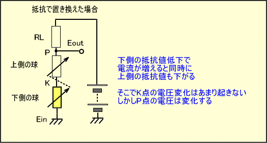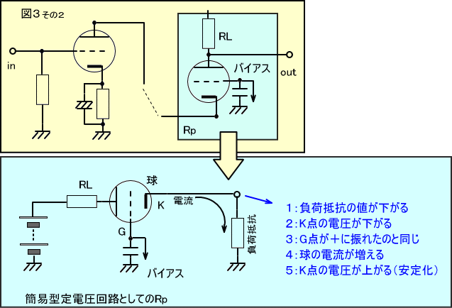 それでもK点に若干増幅された電圧が出るのは、この定電圧回路が簡易型で若干変動してしまうためです。しかしこれが上の球にとって更なるゲインの増大に役立っているわけです。