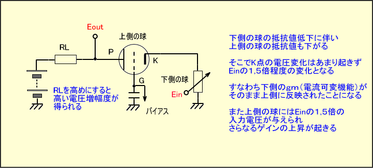 残念ながら下の球の電圧増幅度が低く、上の球のグリッドがアースされていることでP-G帰還の影響が少ないというメリットは、オーディオの高音域ではあまり期待できません。