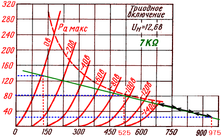 下の図ではバイアスが-92V位で、ちょっと厳しい動作ですがEp=525V、Ip=80mA、RL=7KΩの時やはり12W出せます。