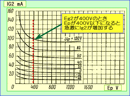 第1グリッドが0V付近になった時、つまりロードライン上プレート電圧がG2電圧よりずっと低い値になった時、