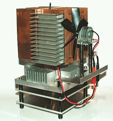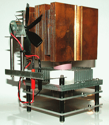 ペルチェ素子用のアルミヒートシンクは実験機よりひとまわり大型のものに変更し、また写真では、6枚羽根ファンの羽根を、熱を加えて急角度にひねったものを着けています。