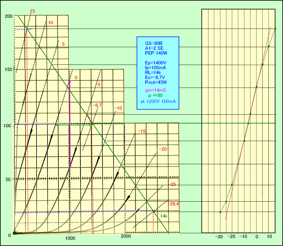 しかし10W位までなら、そこそこ低ひずみなアンプになるかもしれません。カーブよりgm=14mS、μ=80 から内部抵抗は5,7kΩくらいなので、14kΩに対するDFは2,5となり、GGドライブによって1〜1,5程度に下がると考えられます。