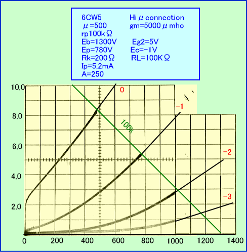 そこでとりあえず購入し測定してみたところ、6BQ5とはまったく異なる特性を持ち、よりハイμ接続向きだと分かりました。また6BQ5の実験からプレート電圧も1500V位はOKらしいので、かなり大胆な動作条件を設定してみました。