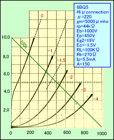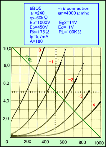するとgmの上昇と共にカーブ全体が左によって電圧利用効率が良くなりました。おかげでプレート供給電圧を900Vにしても200倍のゲインを保ったまま、最適負荷を200kΩまで下げることができたのです。