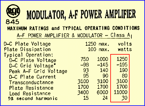このドライバーの活用例として、RCAの規格表から845による30Wフルスペック出力時の設計がマッチすると分かります。またその時の最大出力は入力電圧0,7Vrmsで出せます。