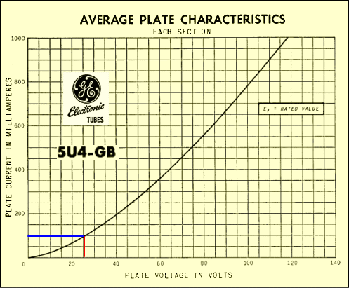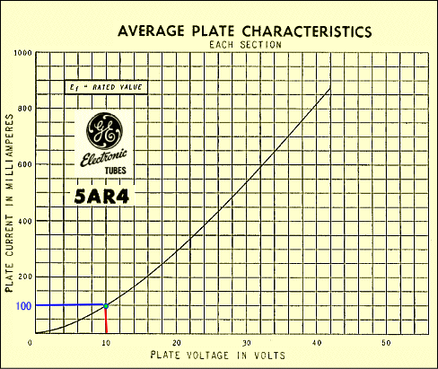 比較としてGEの5AR4のEP−IP特性を見てみると、100mAで10Vつまり100Ωとなって、6AS7による2極管接続の方が若干内部抵抗が低いとわかります。