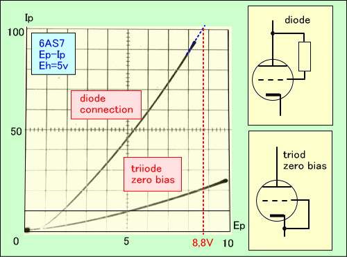 そこで2極管接続時と3極管ゼロバイアス時のEP−Ipカーブを計測してみました。これによると2極管接続時100mAで8,8Vとなり、内部抵抗が88Ωとわかります。またこの時のヒーター電圧は5AR4にならい、あえて5Vとしています。