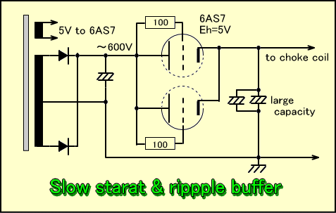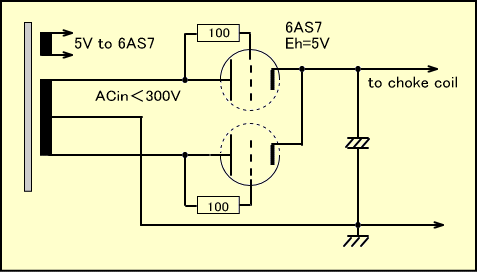 もしかしたら6AS7系は意外と優秀な傍熱型整流管になれるのではないでしょうか。過去にも845を2極管接続して、845シングルに使うという、大変リッチなメーカー製アンプがありました。