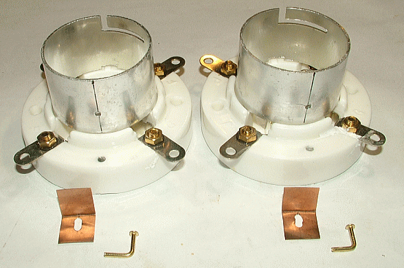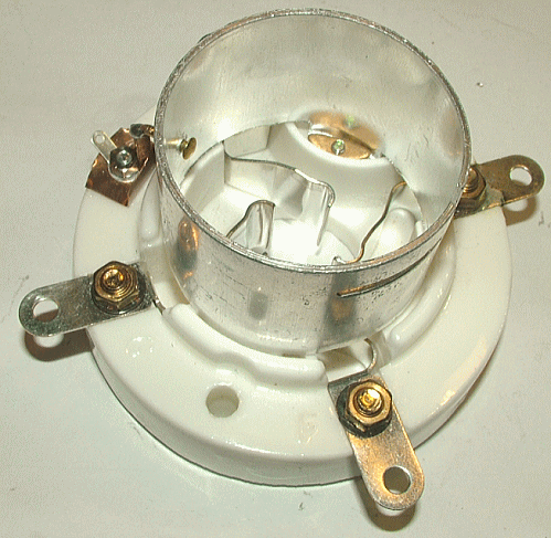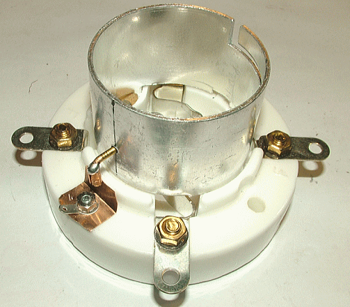 まず中央の足は頭の端子を使うことで考えから除外すると、残った足はUV-845などのラージUXが適合します。次にセラミック部分にM3用のネジ穴をあけ、ソケット上部のリング内側からハカマに設けられた溝に合うよう、真鍮釘とリン青銅でカソード端子を設けました。