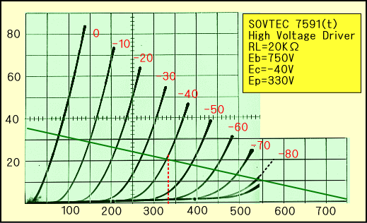 具体的にソブテックのニセ 「7591」3結を使って、プレート供給電圧700Vのロードラインを引いてみると、負荷抵抗20KΩ、バイアス電圧ー40Vでピークトゥピーク400Vくらいスイング出来るスーパードライバーができるとわかりました。