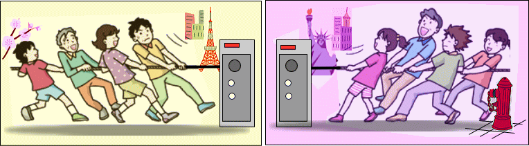 この場合、両者が綱を引き始めたその時、日本からアメリカへ、またはアメリカから日本へ、選手たちが全員瞬間移動したのと同じことが起こります。