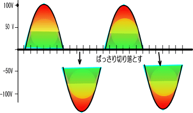 これでは電池など本物の直流とはちがいますが、この程度でも、がまんして働いてくれる電子機器は多くあります。