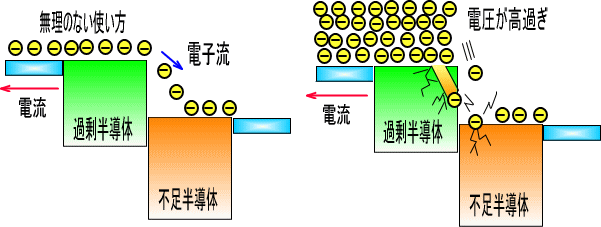 半導体は、混ぜ物をして、電子が過剰気味と不足気味の結晶をつくり、二つを接合すると、