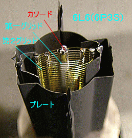また、動作中の真空管は中心あたりに、煌々と光るヒーターが見えます。これがマイナスの電極でカソードといいます。