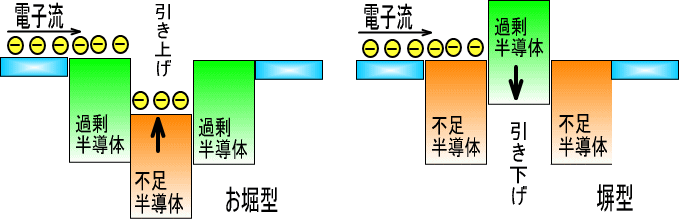 つまり、電子の流れをお堀でくい止め、時々お堀の底を「引き上げ」て、電子を通す方法と、
