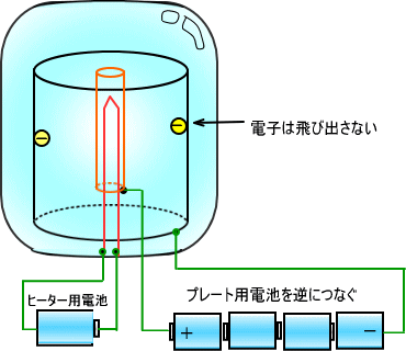 そのためプレートとカソードに逆向きに電池をつないでも、プレートから電子がほとんど飛び出さないのです。
