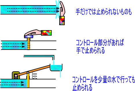通常バルブは手で操作しますが、これを水で操作できるようにしたら、大きな水の動きを小さな水の力でコントロールした、